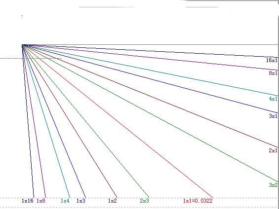 甘氏線的基本比例是1:1,也就是經常說的1*1線。表示單位時間內運行了一個價格單位。此外,甘氏線還有1*8、1*4、1*3、2*3等比例,每一條甘氏線都構成對應的幾何角度。如下圖: