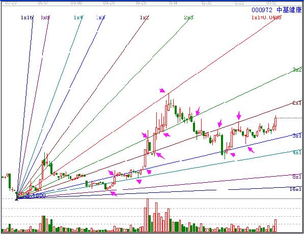 甘氏線雖然常見,但是不是所有人都可以用好,這是因為這僅僅是江恩的比較獨特的工具之一,使用甘氏線還是要完全理解江恩理論的思想,在實戰中才能發揮出來他應用的作用,不然就是套工具罷了。贏家江恩軟件中甘氏線的有兩組,對于甘氏線的研究更是貼近江恩當年的使用,有興趣大家可以多多學習一下江恩角度線欄目的文章或者學習關于江恩角度線的視頻講解。分享一張關于中基健康的贏家江恩軟件甘氏線分析圖形,供大家學習。
