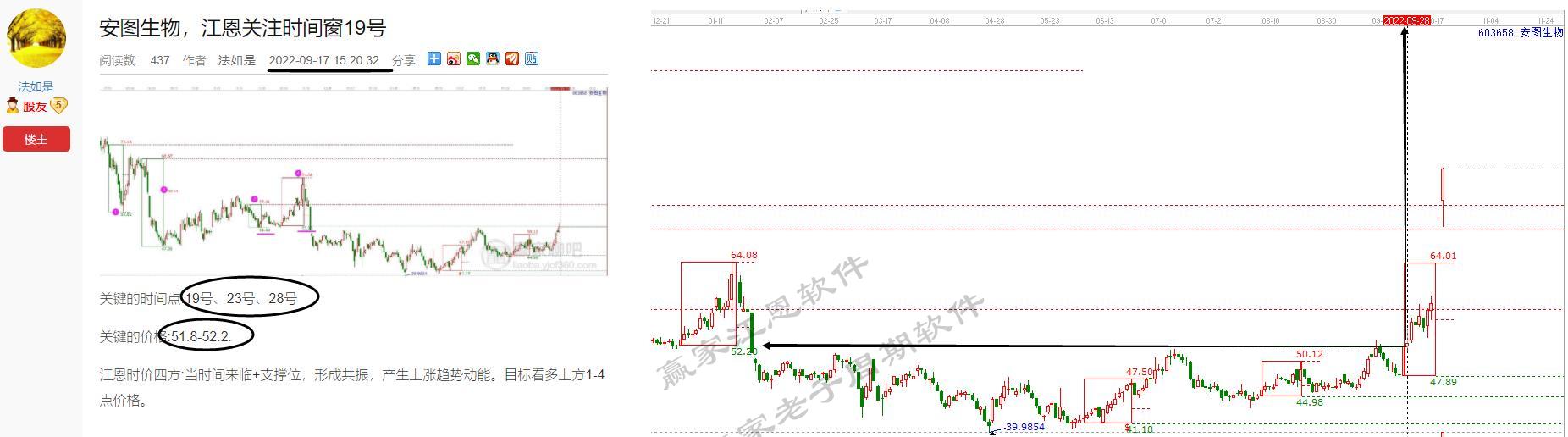 安圖生物依據(jù)老子十二宮工具時價信號,17號 選出,時間窗呈現(xiàn)三個19號,23號,28號。價格預(yù)測51.8-52.2。