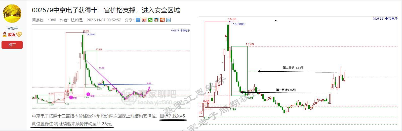 老子十二宮之中京電子, 11月7日關注,預測第一價格9.45,第二價格11.38。 K線14號回踩了下7.99支撐位,直接以10cm姿勢快速上攻,按照工具信號的價格交易者,已經收貨32%的利潤。買點和賣點的信號保駕護航后止盈退場!每次拿到手里的就屬于我們自己的財富。
