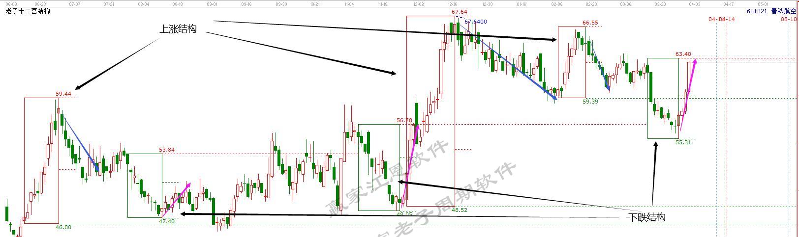 2.下跌結構形成后,股價形成了上漲趨勢,下跌結構代表下跌動能耗盡,看上漲。在實戰交易中,呈現的信號是關注信號。圖中呈現了三個下跌結構,可以觀察,每組下跌結構完成后,股價是不是均保持工具規則的上漲態勢。