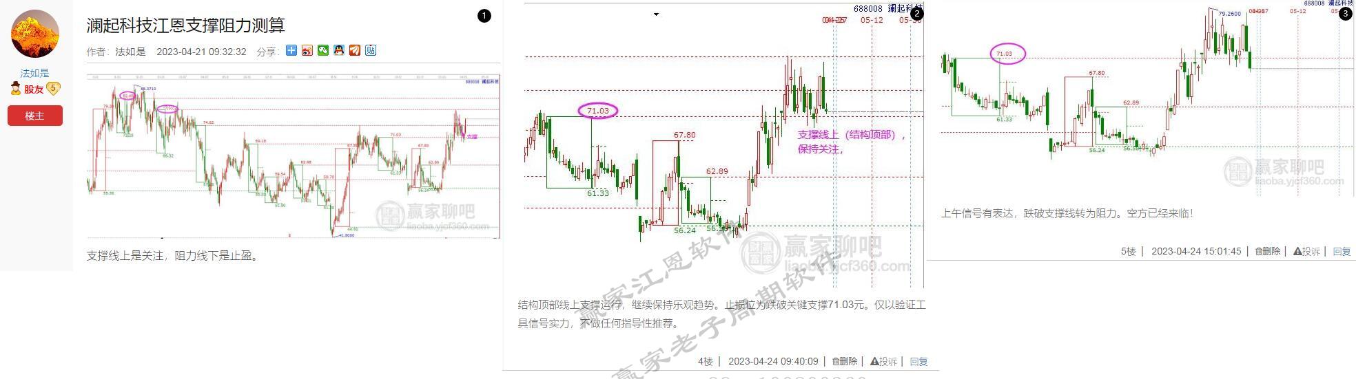 以瀾起科技為例,4月21號關注,空間上股價已經站上十二宮下跌結構頂部71.03元并獲得支撐,按照規則,線上為支撐,視為關注信號。第二步,計劃漲多高,也就是目標位設定哪個空間層次,什么價格。
