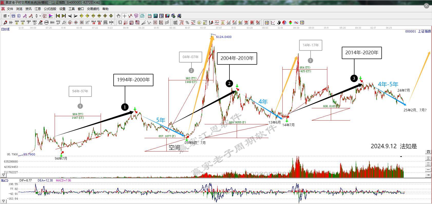 再看時間,縱觀歷史以94年為時間起點,每輪大的上漲周期均為6年,下跌周期為4年,共計10年。說明:贏家的時空周期誤差單位為1(年/月/周/日),若以年為單位,上下空間幅度在100點之內(即是圖中669點-606點),左右時間的誤差同樣在1年(即是圖中回調4年-5年)。以月為單位,每次大牛的時間啟動點均在7月(即是圖中的6月7月),研究歷史預判未來,以史為鏡知興替。本次時空圖表顯示,上證指數即將醞釀形成第四輪大牛市,相似相當即為重復,預計本輪時間啟動點大概率還會在2025年7月左右。回顧歷史,下跌5年周期后,空間拉升歷史最高點6000點,那么本輪若同樣以回調5年的重復,空間6000點-10000點都是大有可能的。同理再往后大膽預測小心求證,2030年是否同樣要規避4-5年的風險周期?直至2034年左右重新開啟新一輪的牛市行情?老祖宗說過,歷史在重復發生...太陽底下沒有新鮮事...所以時勢造英雄,一定是順勢而為!