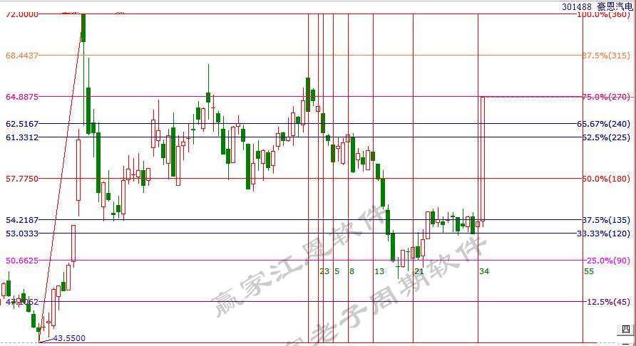 同一板塊下的豪恩汽電,工具信號:1.同樣的時間內12月10日-1月6日的下跌趨勢相比,空間上光庭信息雖更具有支撐位優勢(光庭信息下跌波動節奏在120度止跌,豪恩汽電下跌波動節奏在90度止跌),但豪恩汽電當下走勢恰好處于三分位支撐,兩股相比,豪恩汽電更具持成本優勢,結合費氏時間,2月5日的時間變盤點,形成時價四方的技術信號。2.光庭信息于6號后的上漲雖強于豪恩汽電,但還是那句話臥久者飛必高,對于三分位處的橫盤個股來說時間就是起爆因子,買在變盤點處跟隨即是財富!