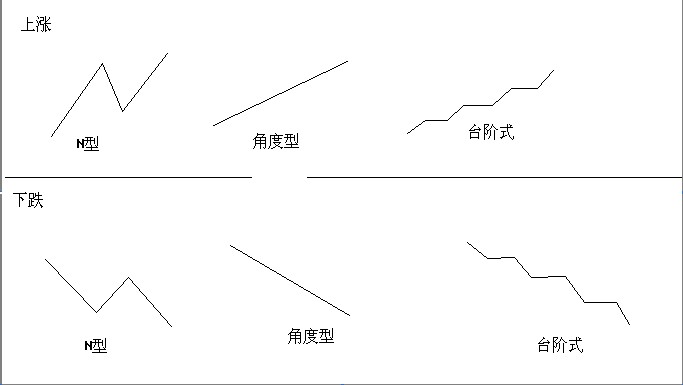市場(chǎng)上漲與下跌的方式有固定的模式,如N字型、角度型、臺(tái)階式、傾斜箱體式,上漲與下跌的運(yùn)行模式正好相反,無(wú)規(guī)律的K線圖形走勢(shì)反應(yīng)出的是無(wú)莊或莊家太惡,這類個(gè)股不是大眾投資者所參與的標(biāo)的,如下圖是市場(chǎng)中常見(jiàn)的運(yùn)行結(jié)構(gòu),用直線畫出其輪廓,其內(nèi)在運(yùn)行K線則有K線組合、K線形態(tài)構(gòu)成;