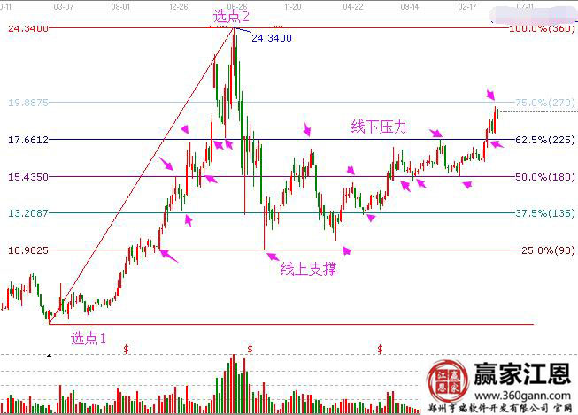 我們以上述股票為例,江恩波段百分比需要作圖:選取一個(gè)高點(diǎn)和低點(diǎn)作圖。這個(gè)高點(diǎn)和低點(diǎn)是歷史上的低點(diǎn)和高點(diǎn),對(duì)于后市的具有分析的點(diǎn)位。圖中選取了這波到達(dá)24.34位置的開(kāi)始的低點(diǎn),以這波行情最高點(diǎn)24.34位置作為第二選點(diǎn)。畫(huà)法很簡(jiǎn)單,選中軟件圖標(biāo)中的圖標(biāo),點(diǎn)擊凹陷,表示選中;接下來(lái)鼠標(biāo)放到低點(diǎn)下方,按住鍵盤(pán)上的shift鍵(可以精準(zhǔn)定位低點(diǎn)位置),定位后松開(kāi)此鍵,右手按住鼠標(biāo)左鍵不松開(kāi),拖動(dòng)到高點(diǎn)(此時(shí)也要像低點(diǎn)一樣精準(zhǔn)對(duì)準(zhǔn)高點(diǎn))選好點(diǎn)好松開(kāi)鼠標(biāo)就可以完成上面的作圖。這個(gè)工具的用法一樣是線上支撐,線下阻力。可以看到圖中高點(diǎn)和低點(diǎn)都出現(xiàn)分割線上。