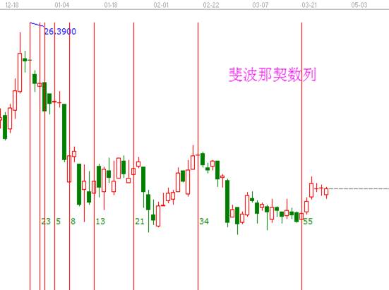 關(guān)于時間周期,則不能不提神奇的斐波那契數(shù)列1、1、2、3、5、8、13、21、34、55、89、144……,這組數(shù)字之間的關(guān)系,有書籍專論,這里不詳細述及。由于它是波浪理論的基礎(chǔ),波浪理論與周期理論也頗有淵源,在運用周期理論測市的時候,不論是從重要的市場頂部或是底部起向未來推算,得出斐波那契時間目標,這些日子都可能意味著成為市場重要的轉(zhuǎn)折點。在這些時間窗口,如何取得交易信號,還需輔以其他技術(shù)手段以驗證。
