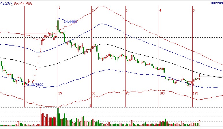 【002289】2012年1月17號至2012年3月7號25個交易日漲幅達150%,使用贏家江恩時間工具黃金分割周期圖做圖,結果如圖2012年8月3號是第5個循環的結束點,同時價格在極反通道弱勢外軌線位置,時間價格達成共振及為操作點;