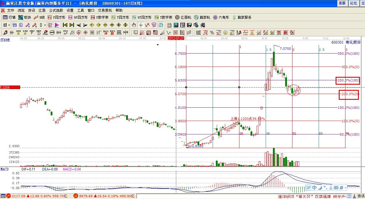 贏家江恩系統波段百分比工具分析:以2012年8月3號2.83為起點,9月13號3.95為終點分析做圖如下,5.07元是價格第二個循環的開始位置,股價上攻回落到此位置轉為震蕩;