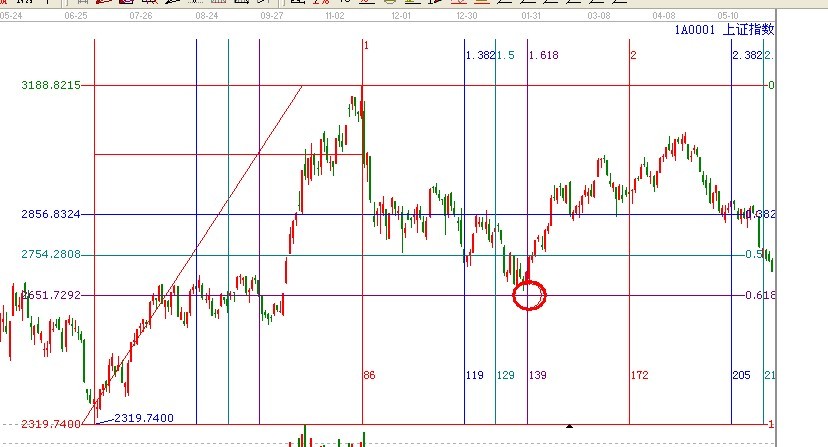 2319.74點到3186.72點運行了86個交易日上漲了866.98點。這一波的回撤跌倒黃金價格的0.618位置附近時間也剛好是黃金分割時間的1.618位置如圖所示: