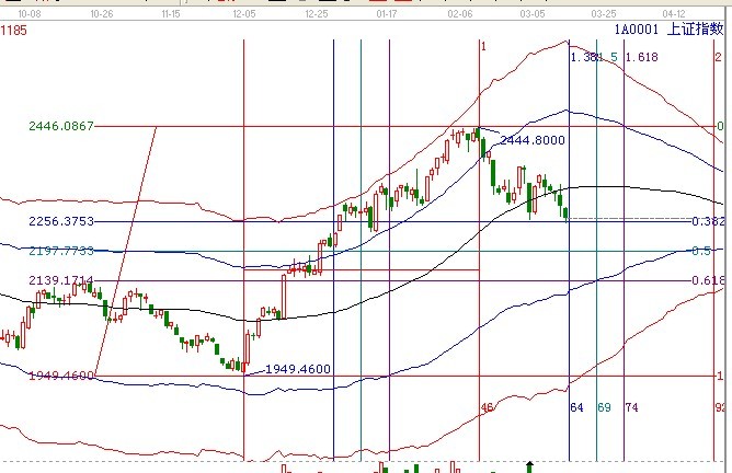 大盤1949.46點上漲到2444.80點運行了45個交易日上漲了495.34點然后展開了一波回調,目前上證指數處于黃金分割0.382位置,時間也是處于黃金分割時間的1.382時間位置,再一次出現了時間跟價格呈四方形的格局。按照江恩理論分析:黃金分割0.382位置2255.58點不破上證指數在這里再一次展開一波行情。
