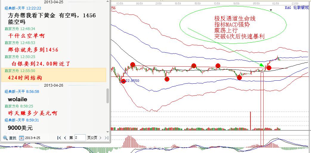 白銀在小時(shí)周期內(nèi)【A】見底后第一波強(qiáng)勢(shì)反彈【1】高點(diǎn)后震蕩下跌至【B】點(diǎn)再次展開了【2】的一個(gè)上行,這里前期【1】位子壓力促使黃金再度下跌,運(yùn)行后在次【3】觸及【2】附近高點(diǎn)快速下跌,在其前期【B】點(diǎn)附近止跌上行構(gòu)成了3點(diǎn)。隨著行情的演繹就構(gòu)成了4次突破的一個(gè)潛在因素,當(dāng)天站穩(wěn)極反通道,指標(biāo)MACD黃白線也上0軸預(yù)示著行情的來臨,在重要的時(shí)間位置以訊而不及之勢(shì)4次突破后快速上行至極反通道藍(lán)色上軌,實(shí)現(xiàn)了快速暴利。