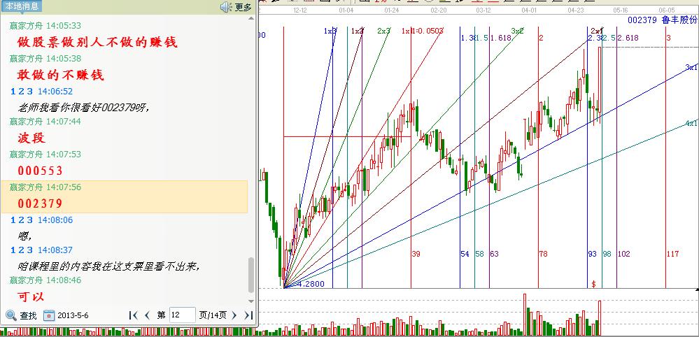 那么我們看002379【魯豐股份】2012-12-04日4.28見底至2013-02-01見頂6.25進行一個回蕩,以波動率為0.0503價格4.28位置做一個角度線,可以看出2個時間結構后股價一直運行在角度線2*3線跟3*1線角度線區域內 ,在其重要時間2.382時間上方江恩角度線壓力提前暴跌。在其昨天也就是3次不破3*1線的位置時間窗口附近,這里做一個交流,2.5時間窗口獲得支撐后今日漲停,這就是時間的魅力
