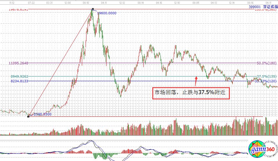 百分比回撤水平的探討主要是研究市場的價格,及阻力支撐的分析,因為一旦價格確定,其價格的波動區間也就確定了,所以,投資者重點關注市場的歷史走勢,以此為后市操作的重要依據,例如市場每次回撤的位置都是在33.33%處,那么,你要參考的就不再是50%水平位,而是33.33%處,所以很多的時候在運用工具繼續分析的過程中我們要靈活運用。如下圖,市場回落,止跌與37.5%附近。