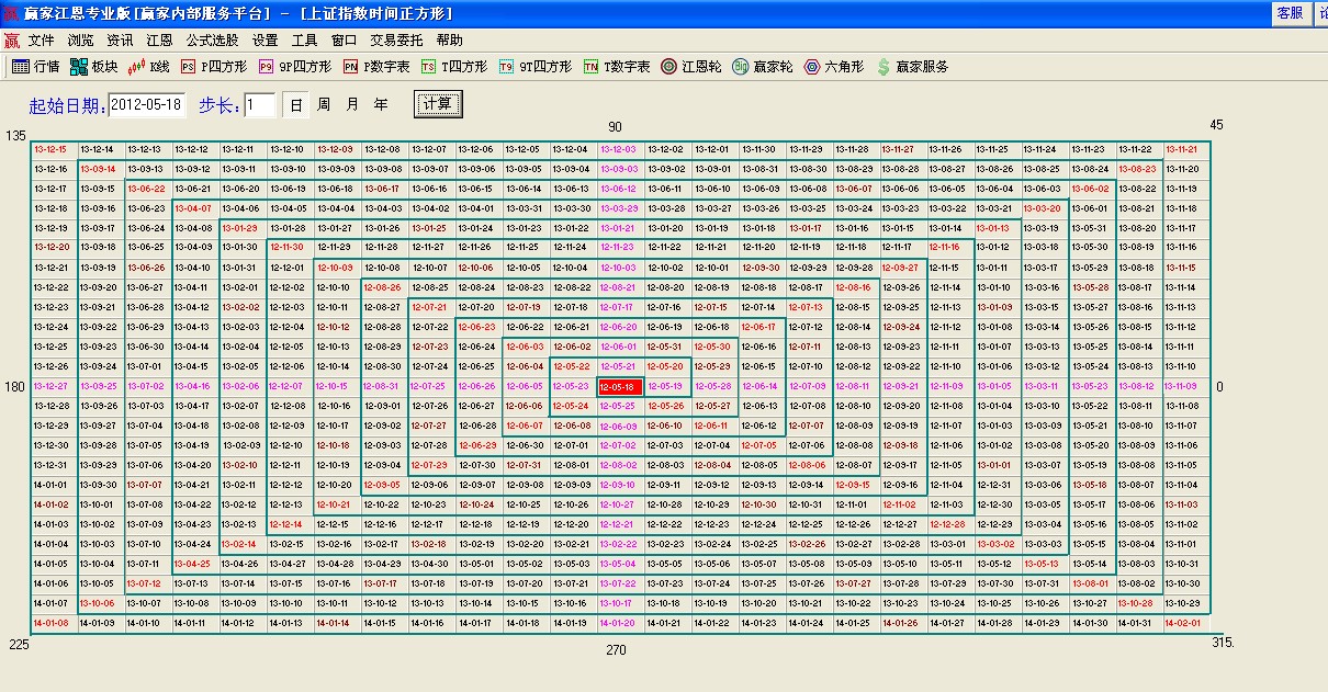 江恩四方形在贏家江恩軟件上使用方法已做過講解大家可百度查詢學(xué)習(xí),今天我們講下手動(dòng)做時(shí)間四方形,首先準(zhǔn)備一張白紙,用1*1的比例畫出四方格子,橫堅(jiān)為25格,圖形做好后中心格子為我們選擇的分析時(shí)間周期的起點(diǎn),然后計(jì)算好步長(zhǎng)(波動(dòng)率),逐步逆時(shí)針展開可以繪圖了;