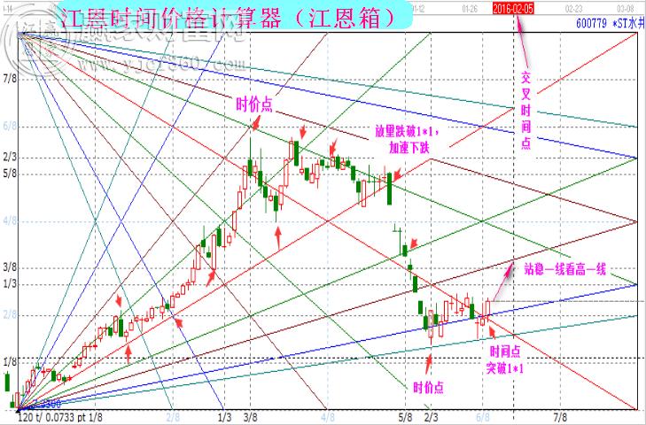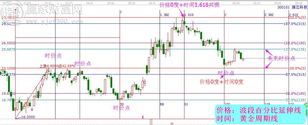 打開一只個股的K線圖。首先,借助江恩百分比等價格工具畫圖,可以得到橫著的價格線;接著,借助黃金周期線等時間工具畫圖,可以得到豎著的時間線。在贏家江恩軟件中,橫著的線為支撐壓力線,豎著的線為時間變盤點。當橫著的線和豎著的線相交叉,即為時價共振點。當運行到時價點時,結合具體的走勢和成交量,進一步確定是買入還是賣出。當然,我們也可以直接使用江恩箱、角度線或者輪中輪,一個工具直接完成時空分析。見下圖。