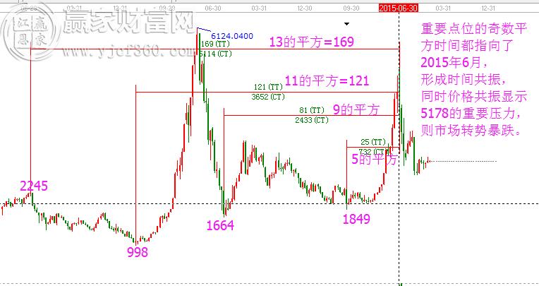 如圖,以上證指數為例。我們就借助時間尺這一個時間度量工具,來計算市場的時間周期。2245是重要的頂部,998、1664和1849都是非常重要的底部,以這些點位對應的日期作為時間的起點,以5178(2015年6月)作為時間的終點,我們可以得到如下數字。169、121、81、25,分別對應13的平方、11的平方、9的平方、5的平方,重要歷史點位的奇數平方時間都指向了2015年6月,則此月份的時間意義將特別重大。同時,5178的價格共振也顯示了此位置的壓力。如此,市場轉勢暴跌。