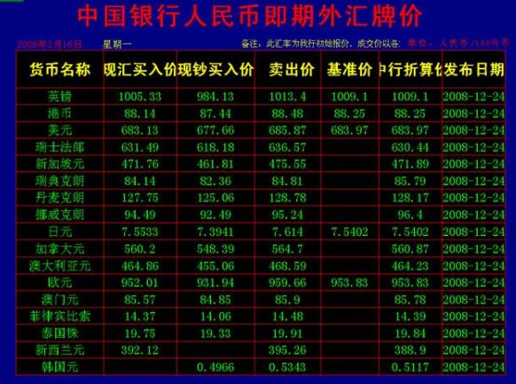 外匯牌價是什么意思?它指的就是外匯指定銀行外匯兌換掛牌價,是各銀行根據中國人民銀行公布的人民幣市場中間價以及國際外匯市場行情,制定的各種外匯幣與人民幣之間的麥苗價格。這種價格在同一天中不變,不同日期則價格是可以變動的。