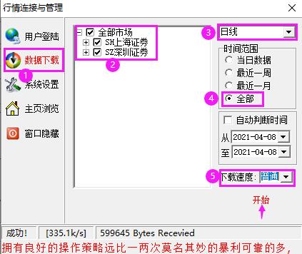 雙擊軟件右下角的燈塔圖標(biāo),打開【行情連接與管理】,點(diǎn)擊左側(cè)的【數(shù)據(jù)下載】,在【上海證券】和【深證證券】前面的方框打鉤選中,右上角的下載內(nèi)容選擇【日線】,時(shí)間范圍選擇【全部】,下載速度選擇【普通】,然后點(diǎn)擊【開始】,直至下載完畢。