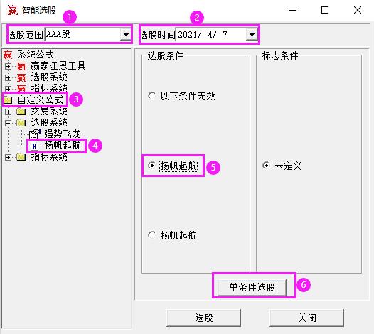 首先,選股范圍點(diǎn)擊旁邊的小三角,選擇AAA股,代表對滬市、深市、創(chuàng)業(yè)板所有上市公司進(jìn)行篩選。其次,選股時(shí)間默認(rèn)為當(dāng)日。接著,依次點(diǎn)擊【自定義公式】——【選股系統(tǒng)】——【楊帆起航】——【單條件選股】。