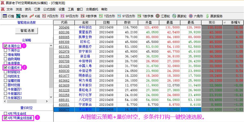 贏家江恩云策略智能選股功能,主要分為AI智能選股與技術(shù)選股兩大類型,以日線數(shù)據(jù)為選股基礎(chǔ),多條件打鉤匹配,一鍵快速篩選優(yōu)質(zhì)個(gè)股。AI選股模型為贏家財(cái)富網(wǎng)數(shù)據(jù)倉庫+時(shí)間周期密碼+數(shù)學(xué)量化模型+行業(yè)深度研究+資金動向的智能選股平臺,底層邏輯均是依托時(shí)間周期密碼運(yùn)行,目前贏家共推出十余種智能選股模型,詳見【贏家老子時(shí)間周期證券分析系統(tǒng)】介紹。技術(shù)選股主要將贏家多年實(shí)戰(zhàn)總結(jié)的選股模型編寫成選股指標(biāo),幫助投資者來篩選出符合條件的個(gè)股。軟件主要精選了4個(gè)選股器,分別為揚(yáng)帆起航、強(qiáng)勢飛龍、股海擒龍和靈蛇之珠。先來了解下這4個(gè)選股器的設(shè)計(jì)原理及選出來的個(gè)股風(fēng)格,方便用戶根據(jù)自己的操作需求選擇相應(yīng)的選股器。